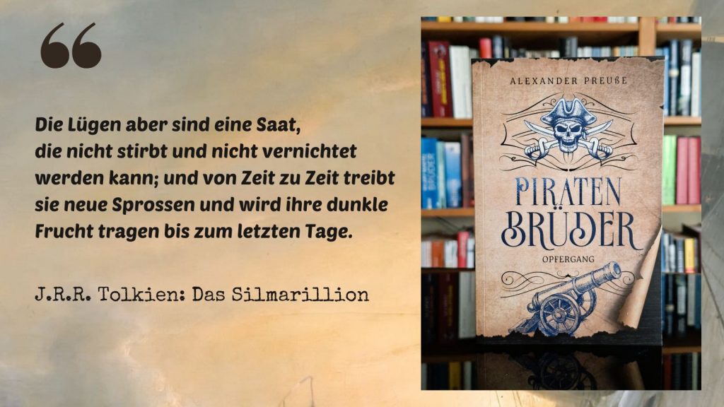 Kämpfen, wenn der Gegner unbesiegbar ist? Die Lüge ist so ein Gegner, einmal in die Welt gesetzt, kommt man nicht mehr dagegen an. J.R.R. Tolkien wusste um die Macht der Lüge und auch um ihre Unsterblichkeit, denn sie lässt sich nicht ausrotten. In seinem Silmarillion hat Tolkien das in einen treffenden Satz gefasst, den ich als Zitat dem Schlussband meiner Buchserie um die Piratenbrüder vorangestellt habe.